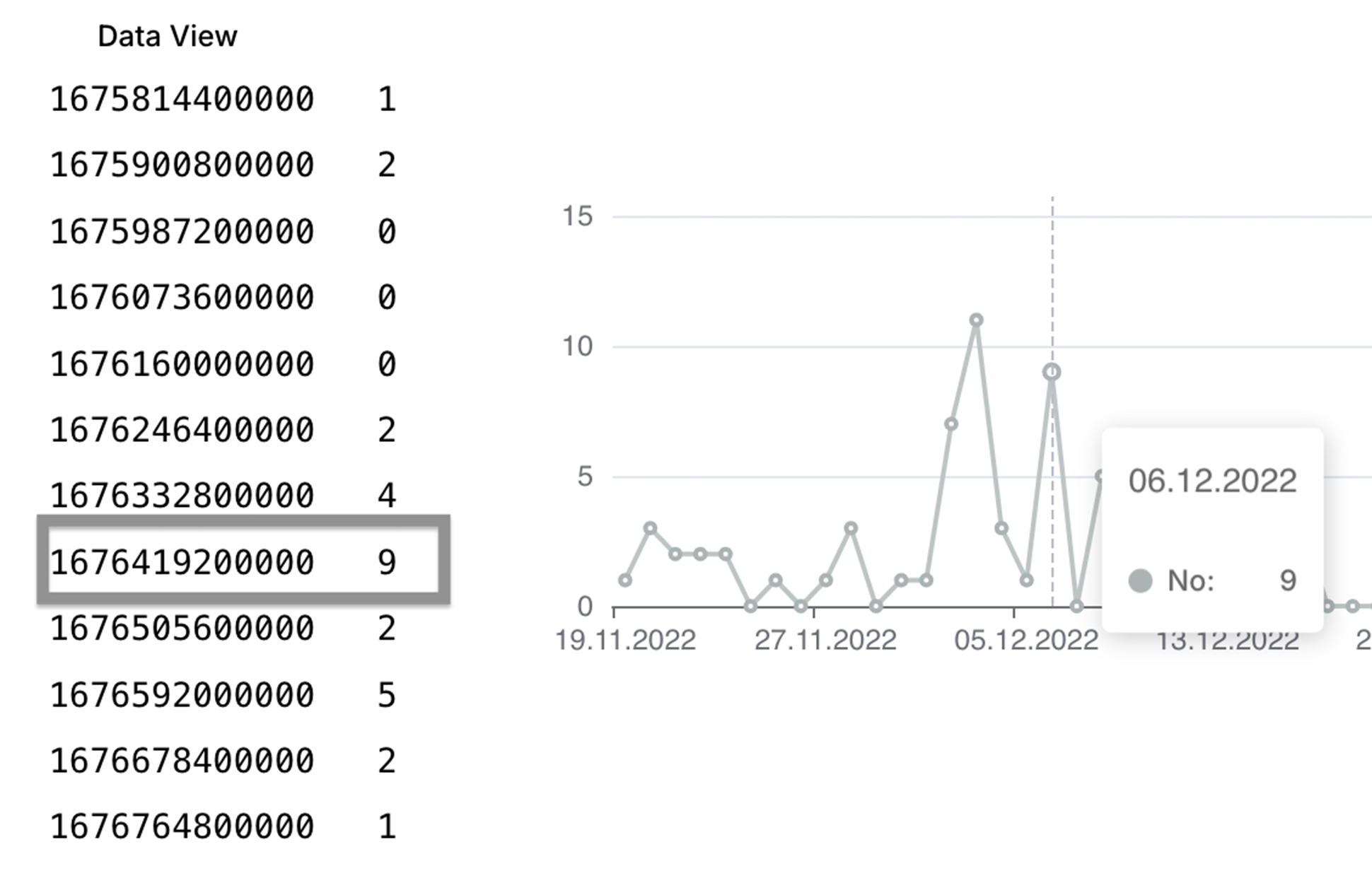 Just like in text and table formats, you can view the results of text searches in the chart format. We can select the "Unit Title" category and enter the word Україна (Ukraine) in the search field. As a result, the chart will display how many times and when the word Україна (Ukraine) was used in the selected archival units.