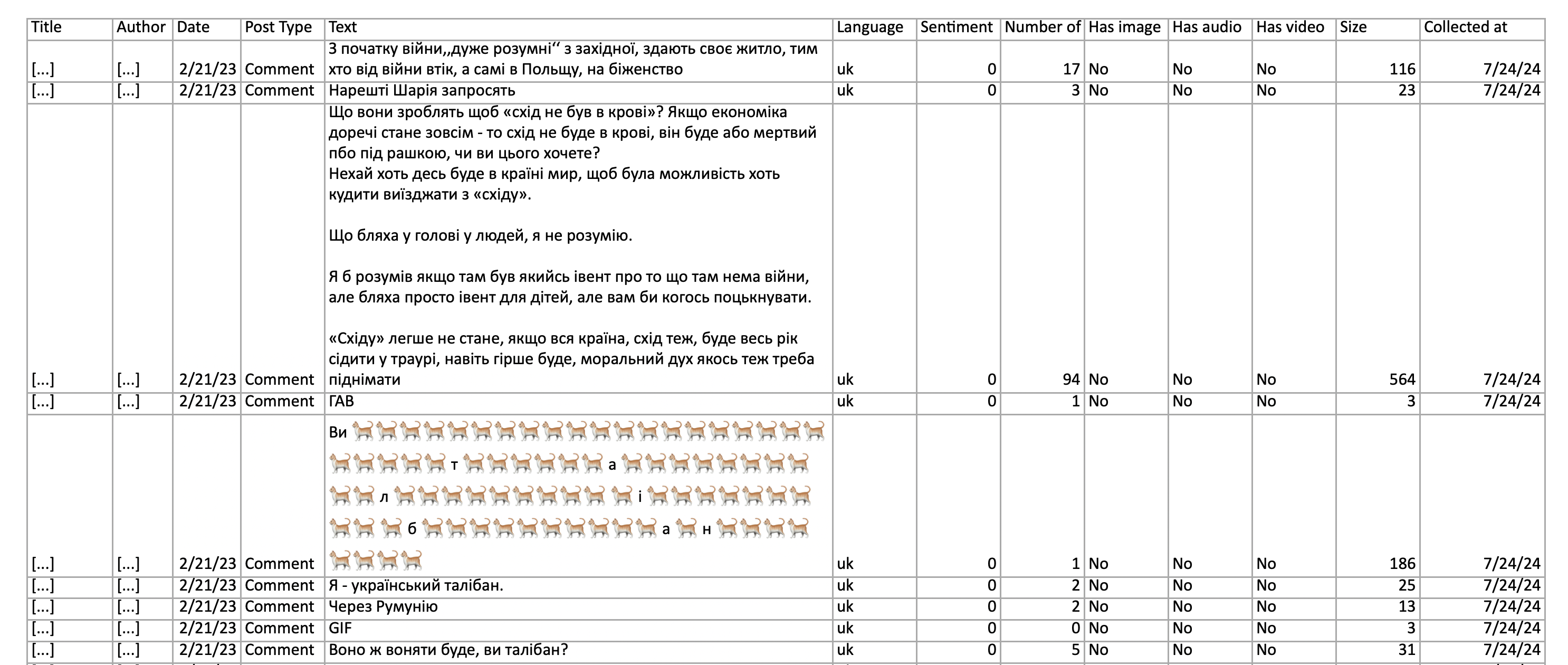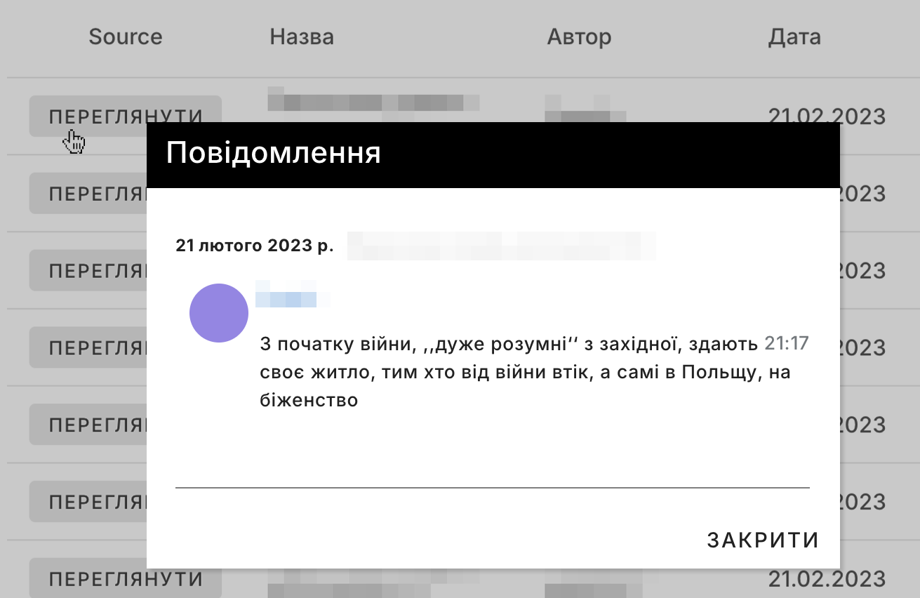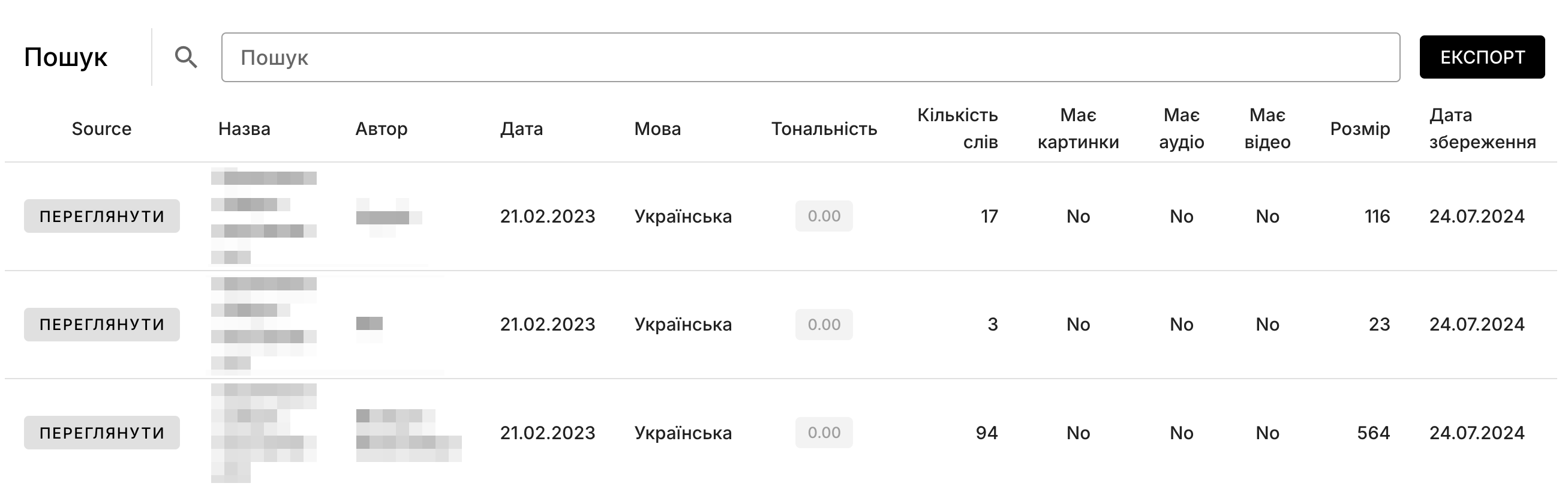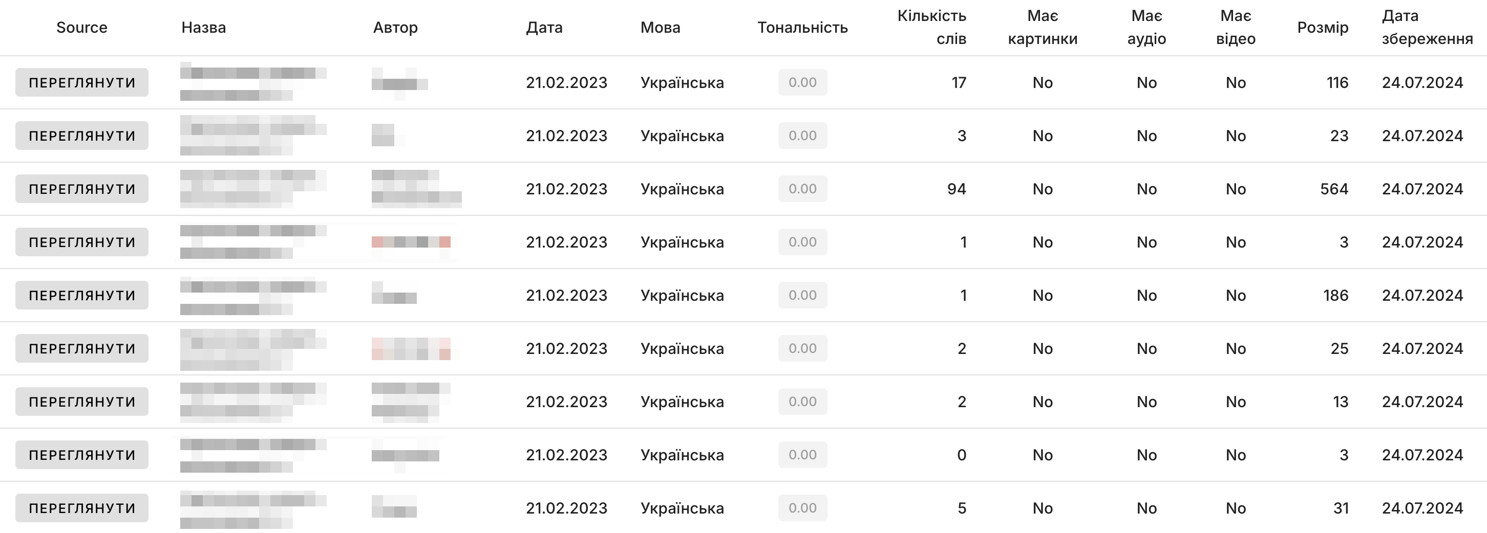 Таблиця містить додаткові дані про кожне повідомлення запиту: мову, тональність, кількість слів, розмір.