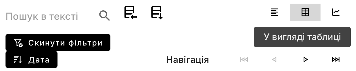 За замовчуванням результати запитів в інструменті відображаються як [потік повідомлень](https://blog.telegram.lvivcenter.org/tg_research/viewing-mode/text) <img src="https://3532624983-files.gitbook.io/~/files/v0/b/gitbook-x-prod.appspot.com/o/spaces%2FqNBQcg3X1ZI5v9Czy3Rk%2Fuploads%2FlWCJB812kLf6yHwsHlvS%2Ficons8-align-left-96%201.png?alt=media&#x26;token=67f9b029-b624-44f7-8af8-dbd31b297772" alt="" data-size="line">, але також можна обрати функцію відтворення у форматі табличних даних <img src="https://3532624983-files.gitbook.io/~/files/v0/b/gitbook-x-prod.appspot.com/o/spaces%2FqNBQcg3X1ZI5v9Czy3Rk%2Fuploads%2FaTf9Wz8StQJvEXgj1TID%2Ficons8-table-96%201.png?alt=media&#x26;token=c920f444-f8dd-4077-a3cf-dd90242c66a8" alt="" data-size="line">.